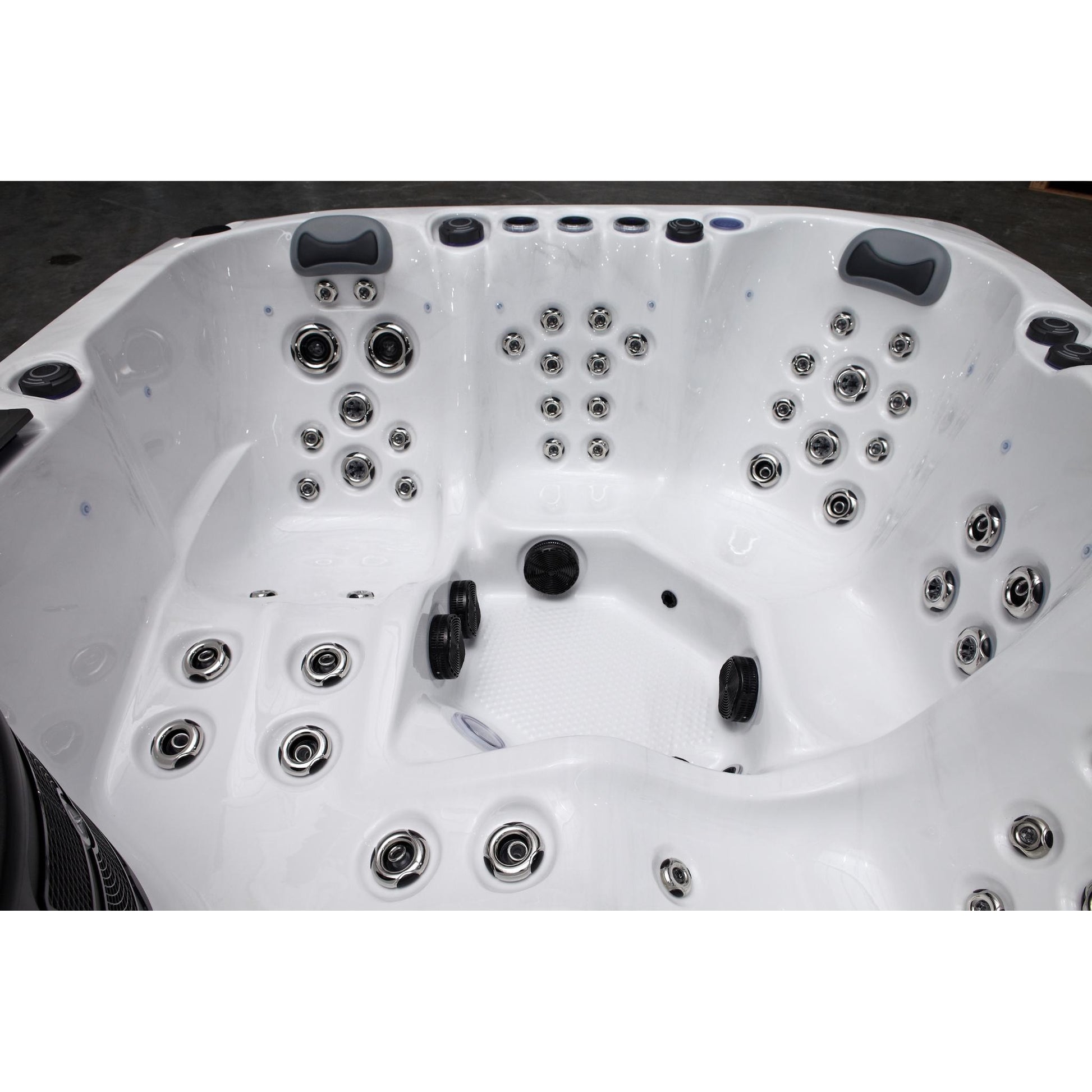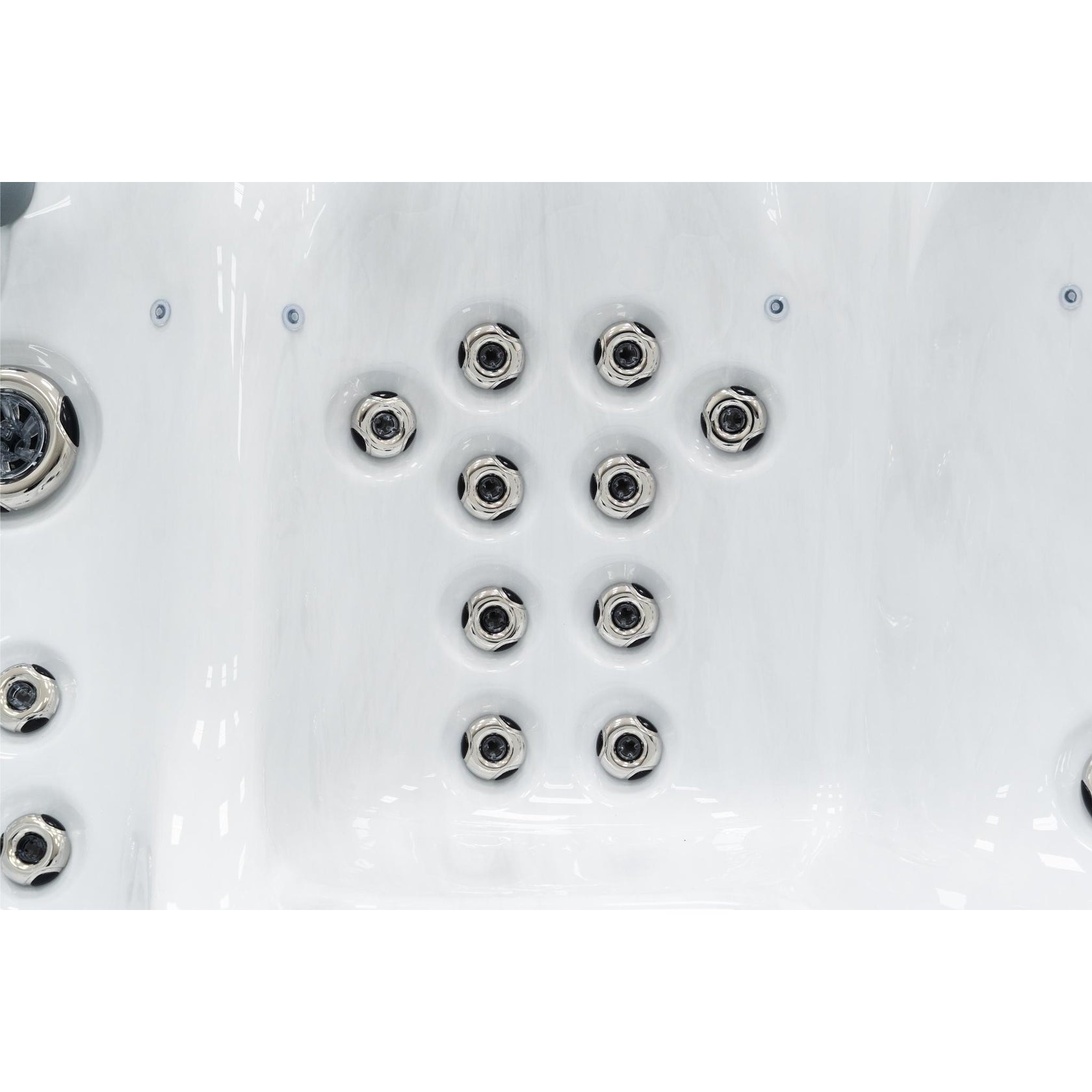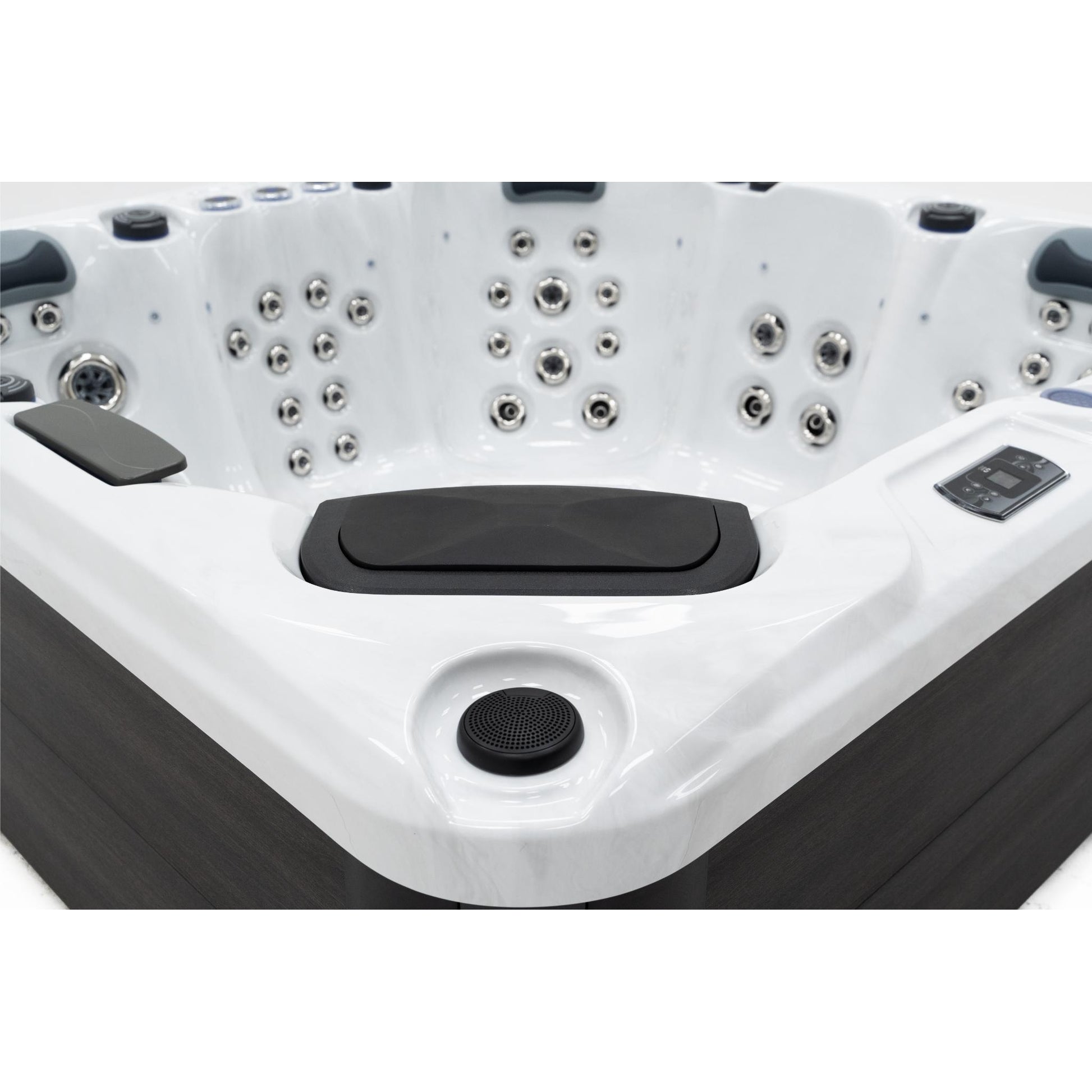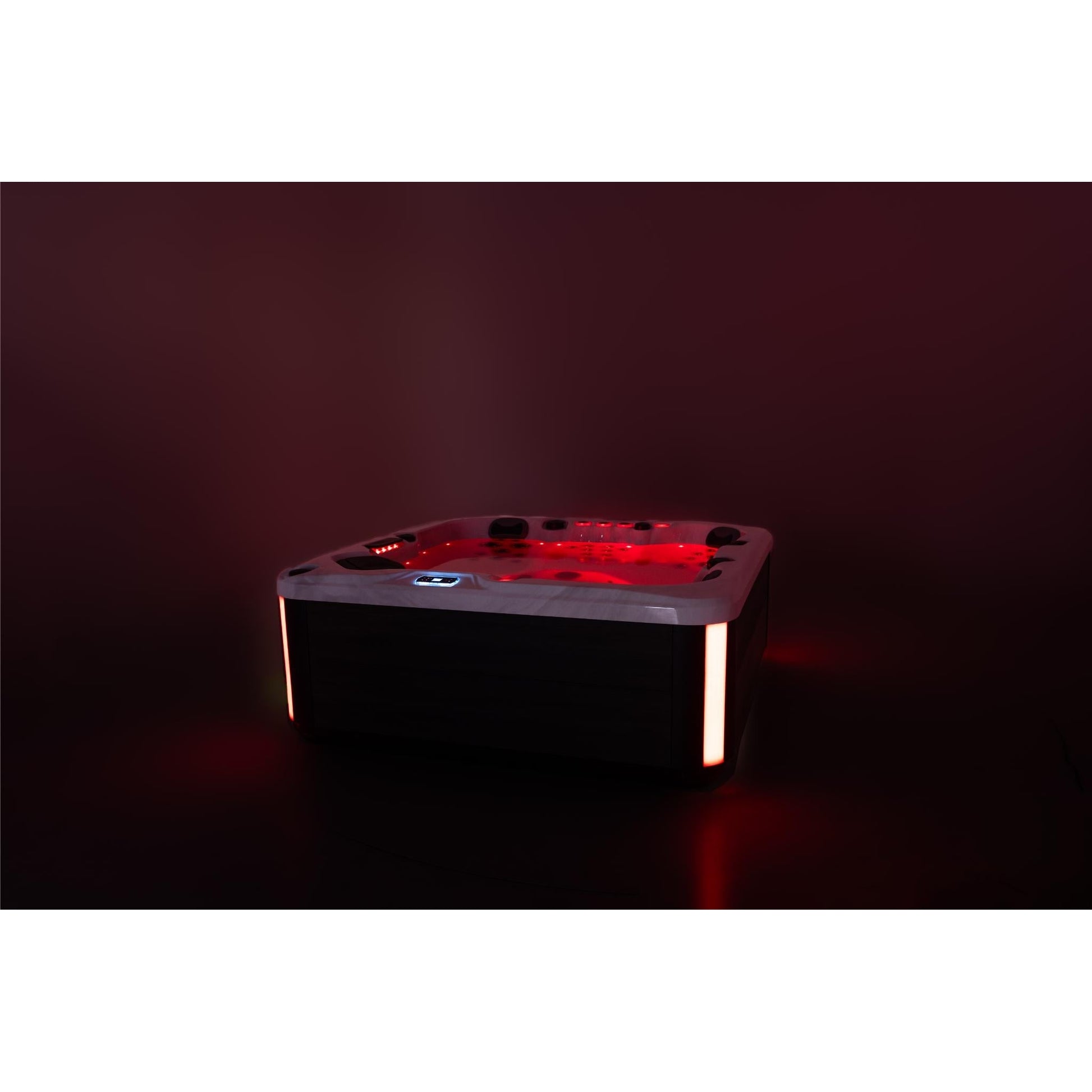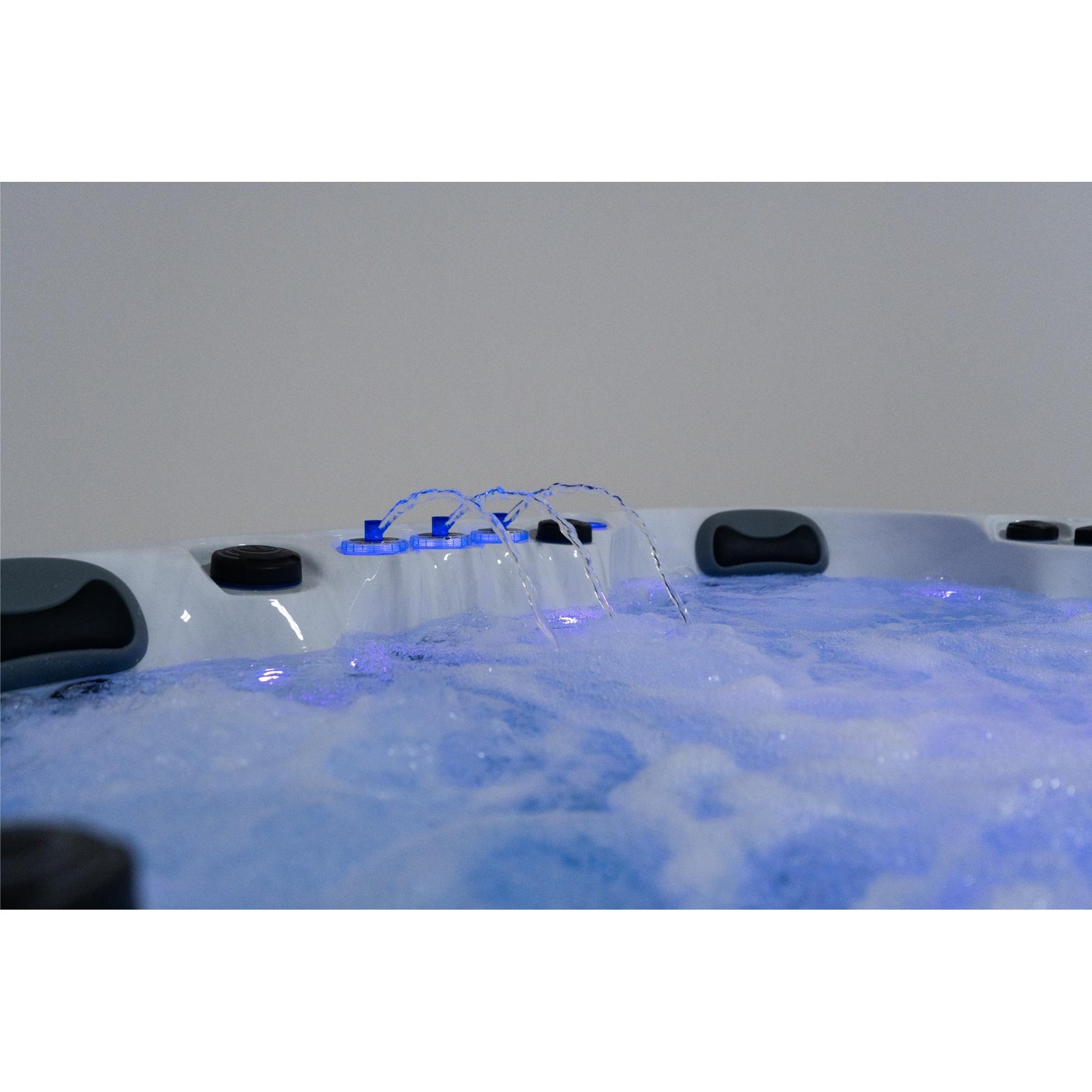 The Aquaglow's modern styling features a stunning Sterling Silver acrylic shell, complemented by sleek grey side panels and ambient perimeter and corner LED lighting that sets the mood day or night. Enjoy your favourite playlists through the built-in Bluetooth sound system with dual speakers for a fully immersive experience.
